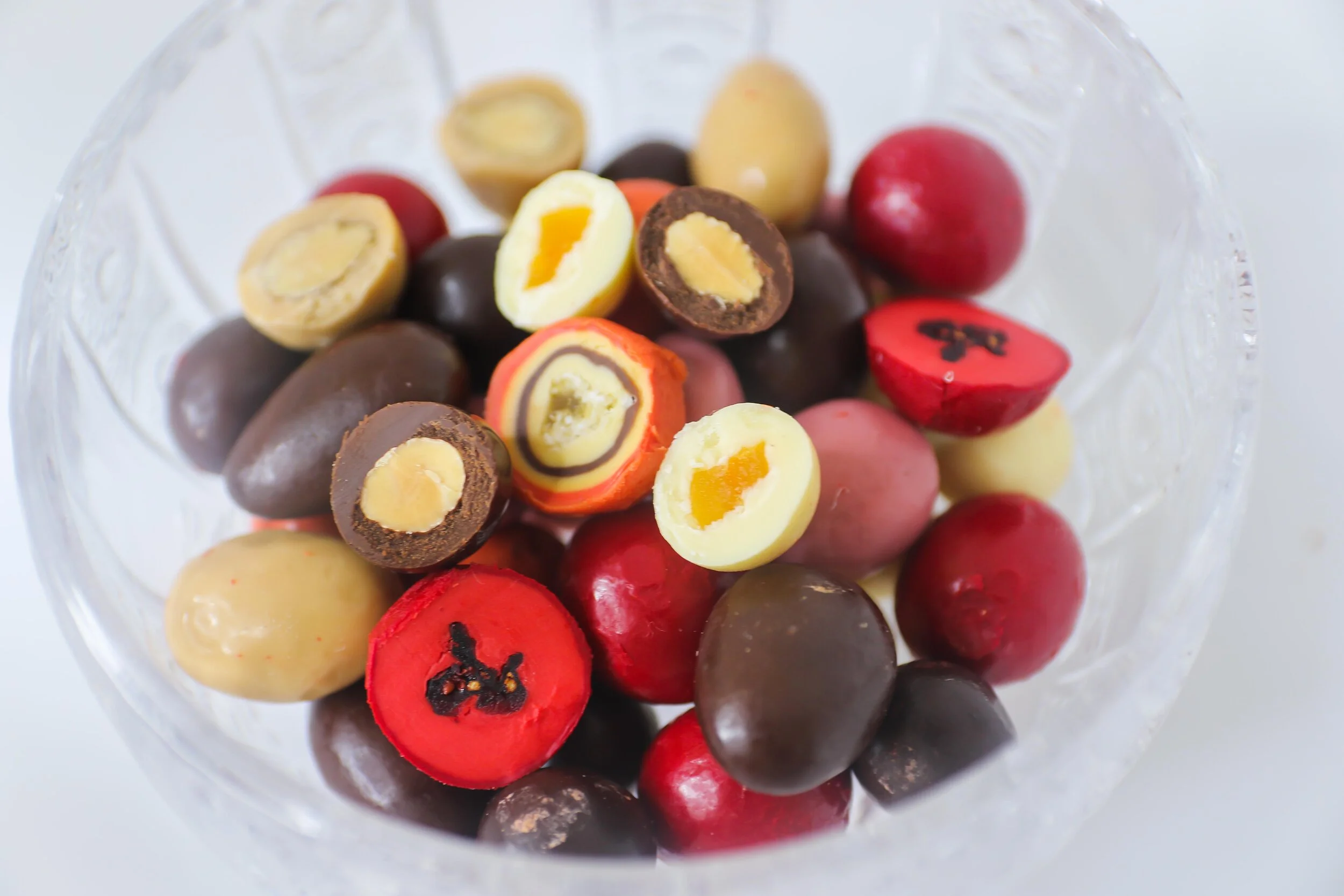 Confetes com frutas selecionadas ou amêndoas de combinações apuradas de recheios e coberturas que causam uma sensação surpreendente ao paladar.
